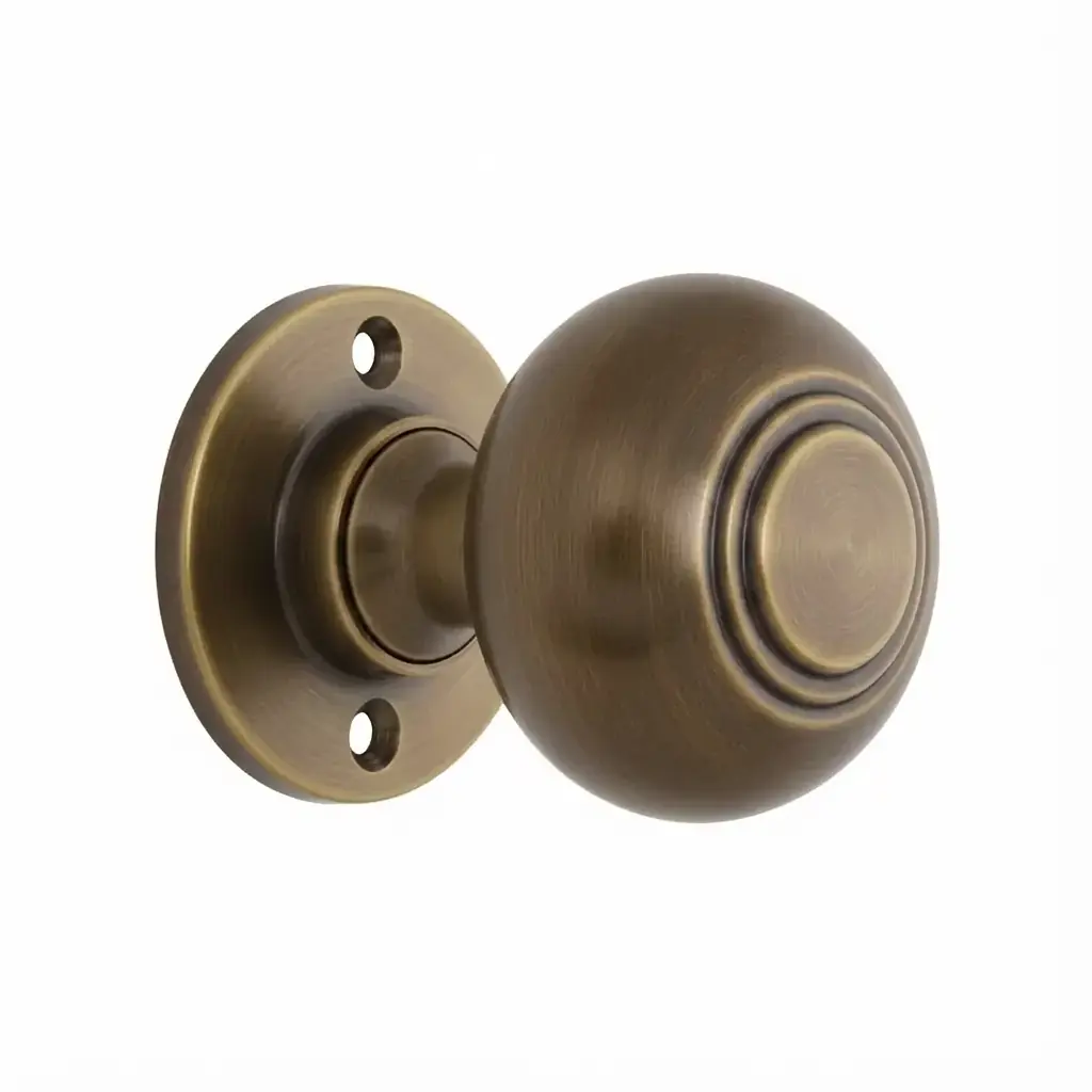 Enhancing the look and functionality of interior doors, the Spherical Door Knob Set on Rose features smooth, rounded knobs mounted on polished rosettes.